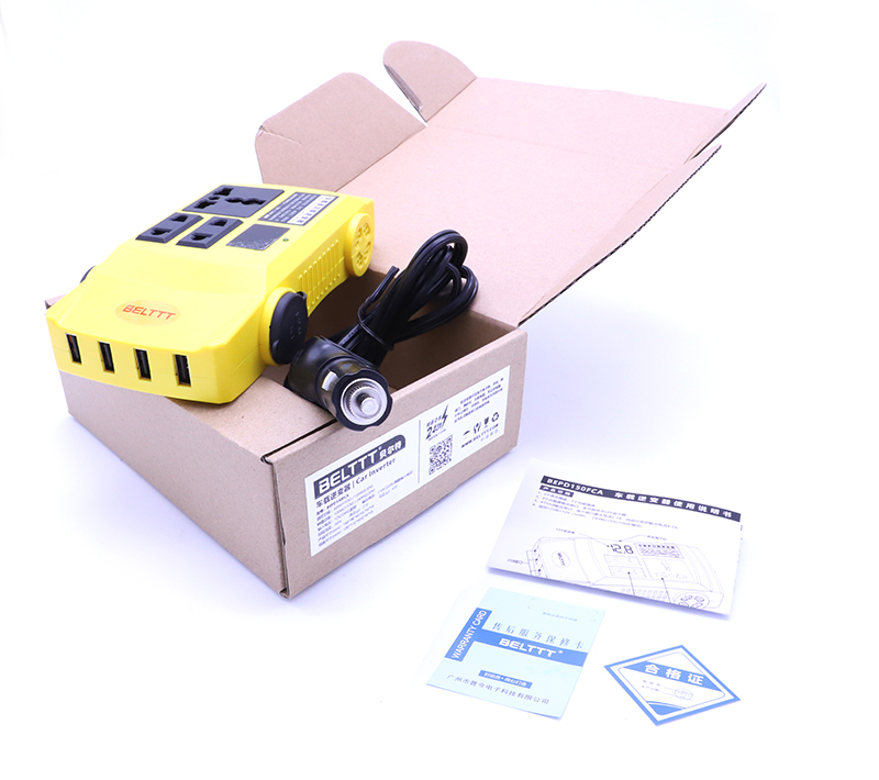 装箱内容包含BEPD150FCA车载逆变器主机一台、车充1个、说明书、保修卡、合格证各一份。