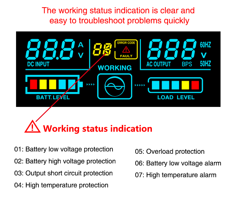 5. la pantalla LCD muestra los parámetros de trabajo, la alarma y el Código de falla, y el Estado de trabajo es claro de un vistazo ;
